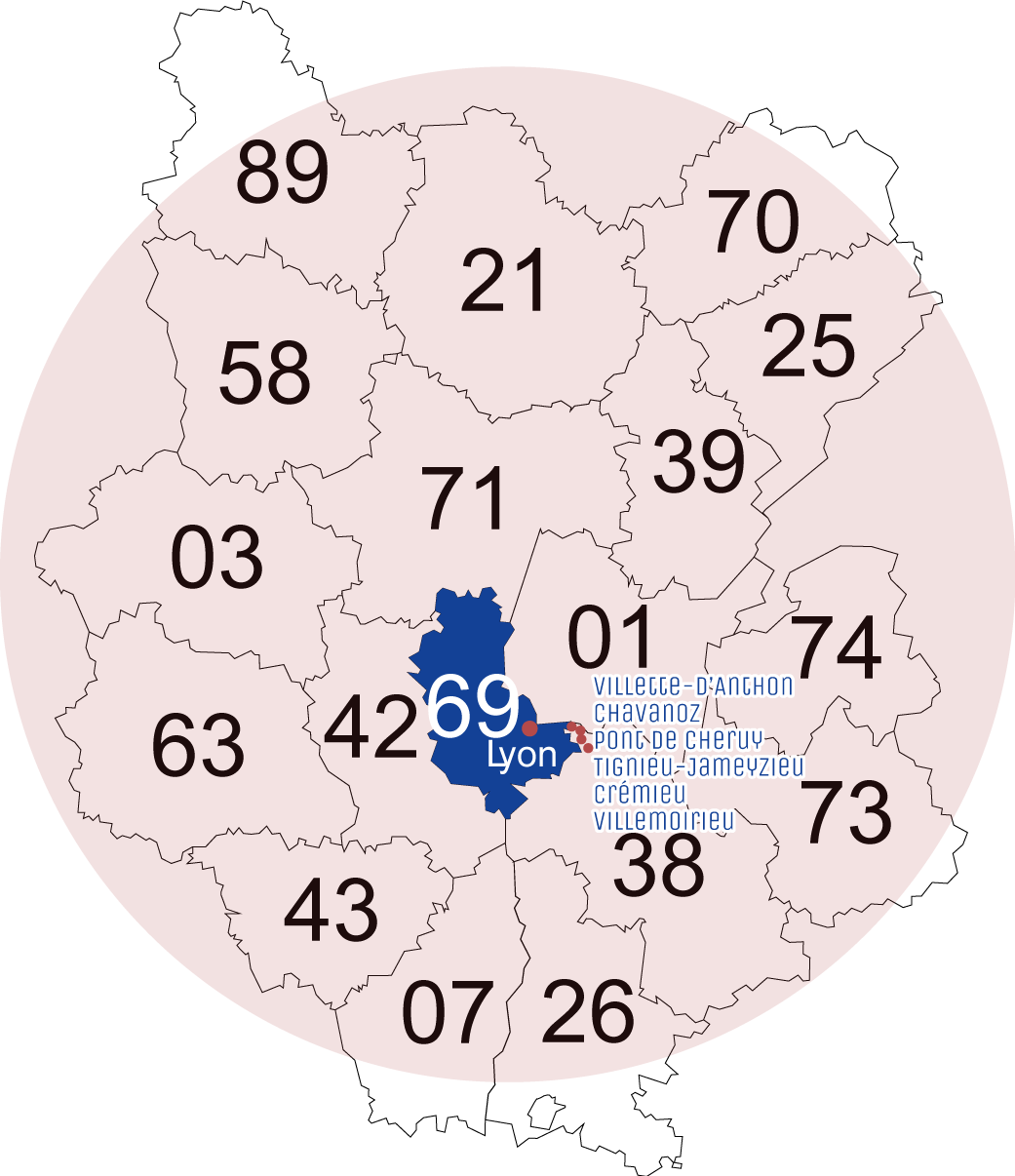 L’Ain (01), l’Allier (03), l’Ardèche (07), la Côte-d’Or (21), le Doubs (25), la Drôme (26), l’Isère (38), le Jura (39), la Loire (42), la Haute-Loire (43), la Nièvre (58), le Puy-de-Dôme (63), la Haute-Saône (70), la Saône-et-Loire (71), la Savoie (73), la Haute-Savoie (74), l’Yonne (89).